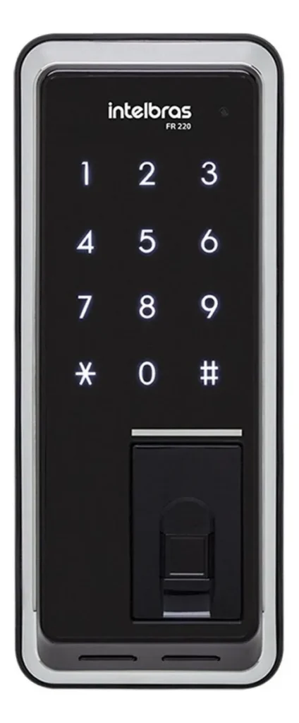 - A Fechadura digital de embutir FR 221 V da Intelbras oferece acesso por até 105 senhas (sendo 1 de administrador, 4 de visitante e 100 de usuário), 100 digitais e chave física, além de contar com entrada USB-C para alimentação de emergência