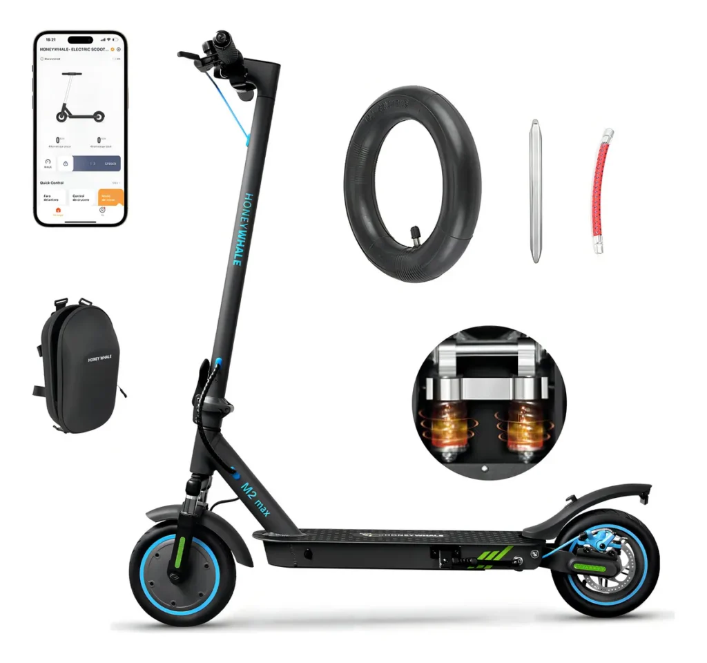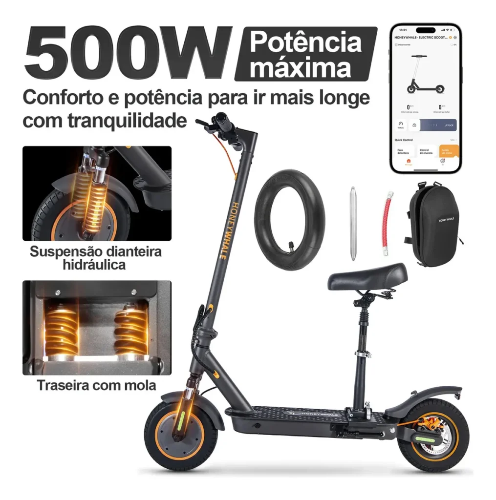 | 4 | Honeywhale M2 MAX | 500W | 32 km/h | 22 km | 120 kg | 🛡️ Suspensão Dupla |